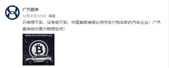 今天中午广汽蔚官方微博发布:“只有想不到,没有做不到,中国首家接受比特币支付购车款的汽车企业!广汽蔚来给你更大畅想空间!” 并配以大幅海报。成为国内首个支持比特币支付的车企。