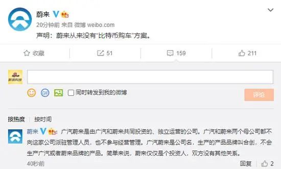 广汽蔚来的这一系列堪称乌龙的操作也直接引发了蔚来的回应,蔚来官方微博发布声明称,从来没有“比特币购车”方案。