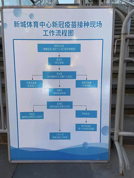 2020年12月31日下午五点,记者来到大兴区新城体育中心,场馆入口处已经立起“接种入口”和“疫苗接种现场工作流程图”的牌子,场馆内已经布置了多处登记台。现场工作人员表示,目前不对个人开放,都是和政府合作,为单位进行接种服务。“现在是重点人群接种,个人接种再等等吧。”