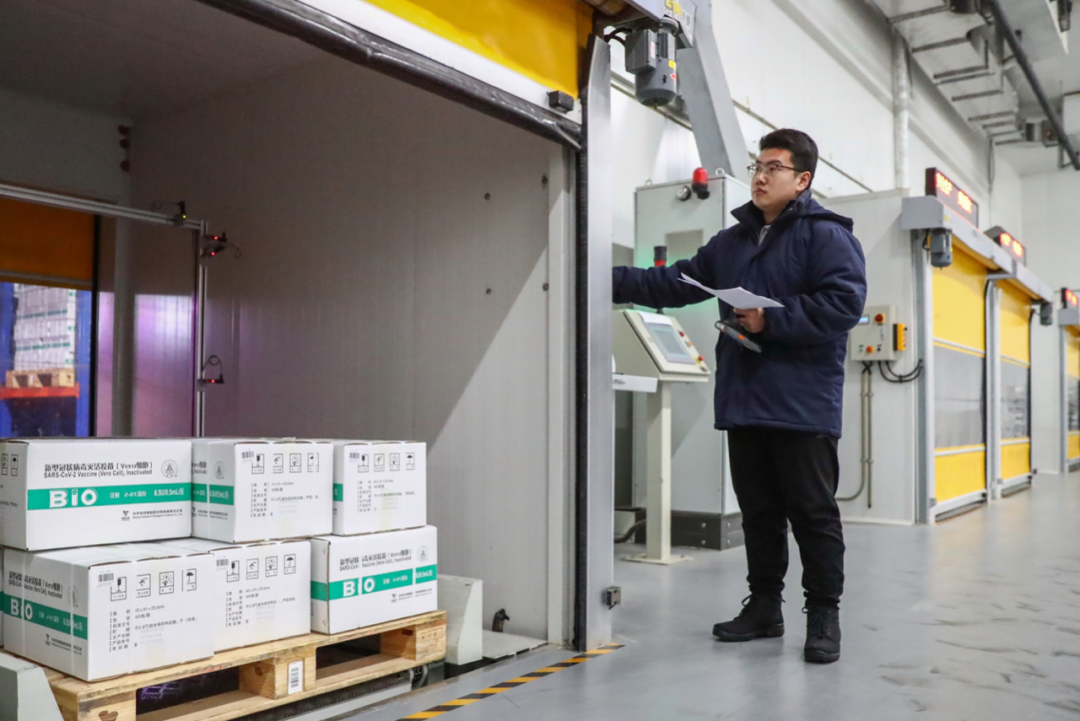 12月25日,工作人员从国药集团中国生物北京生物制品研究所的疫苗冷库打开出货口。
