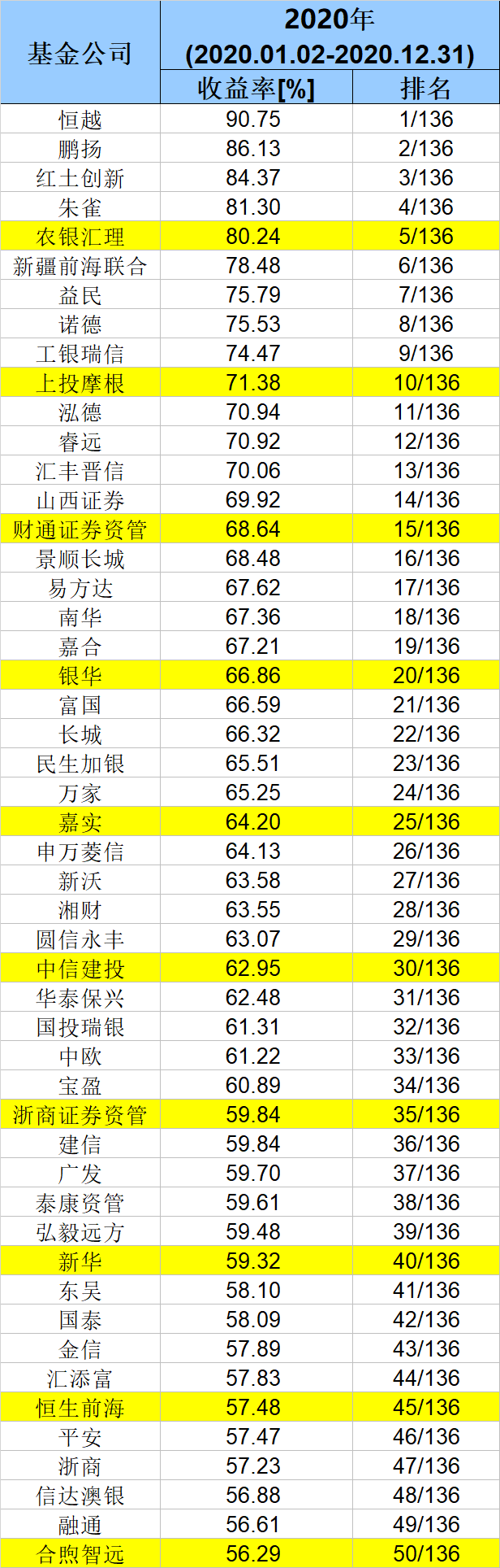 在这样的环境下,究竟哪家基金公司脱颖而出?海通证券数据显示,全部基金公司2020年都获得正收益,更有5家基金公司收益超80%。
