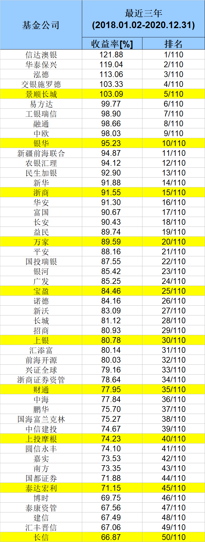 从3年期(2018年1月2日到2020年12月31日)绝对收益排名看,信达澳银旗下权益类基金平均收益率达到121.88%,在110家公司中排名第一,显示出该公司在最近3年市场中抓住了市场机遇。