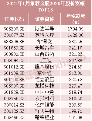 从二级市场表现看,上述推荐“金股”中斯达半导2020年累计涨幅接近1800%,英科医疗2020年累计涨幅超过14倍,涨幅居前的还有华润微、长城汽车、山西汾酒、比亚迪等个股,2020年涨幅均在300%以上。