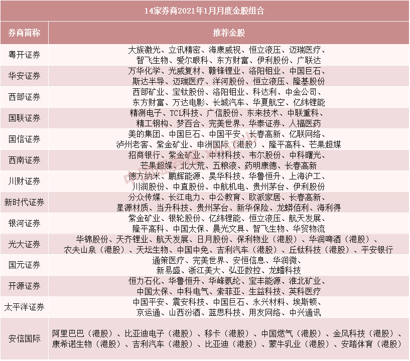 截至1月2日中证君发稿,目前已有14家券商披露了2021年1月投资组合,其推荐的A股及港股近120只个股覆盖了机械设备、建筑材料、有色金属、化工、食品饮料、医药生物、电子、非银金融、计算机等数十个细分领域。
