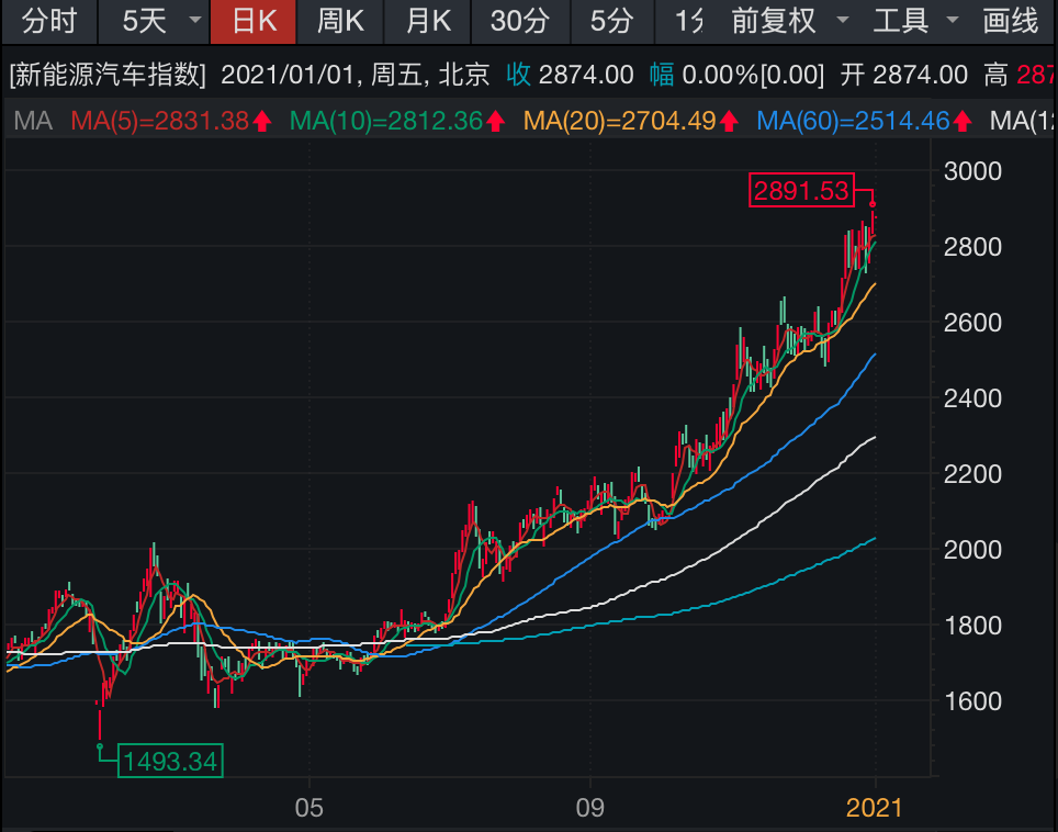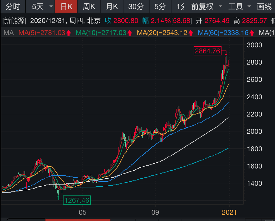 据Wind数据,A股市场上,新能源板块2020年可谓涨势如虹。该板块2020年开年延续了2019年底的涨势,连续上涨近3个月至阶段高位后有所回调;触底反弹后高歌猛进,不断刷新年内高位。