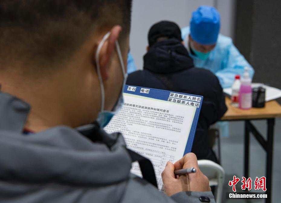 接种人员在设置于北京市朝阳区朝阳规划艺术馆的临时接种点内填写接种知情同意书。