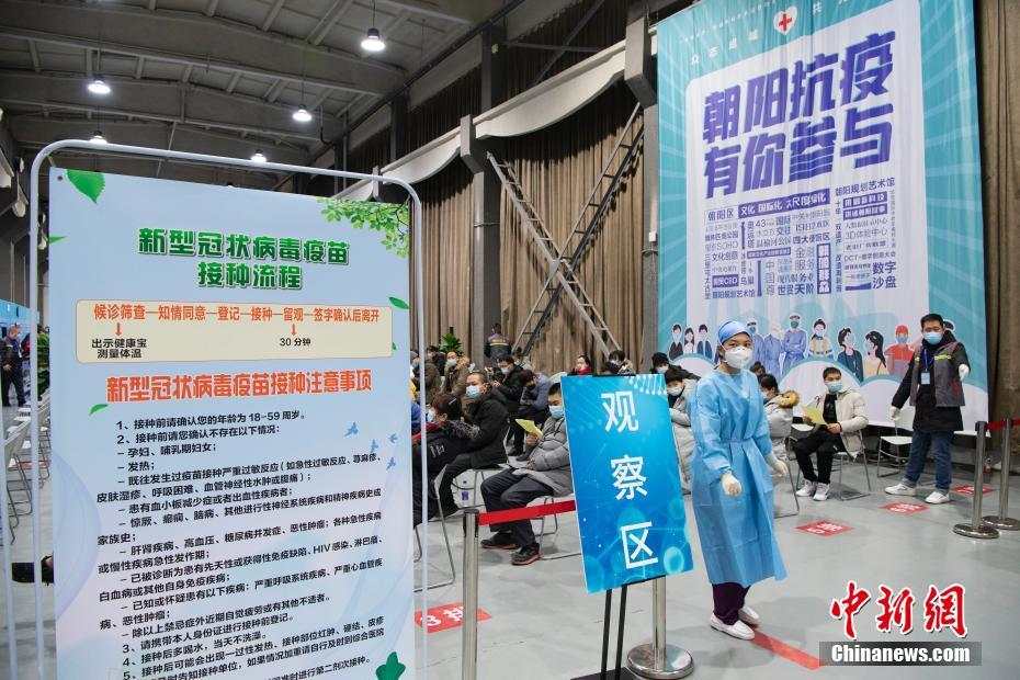 接种人员在设置于北京市朝阳区朝阳规划艺术馆的临时接种点参加新冠病毒灭活疫苗接种,人员在接种后需在观察区留观30分钟无异常后方可离开。