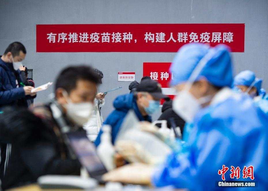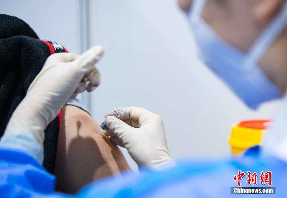 医护人员在设置于北京市朝阳区朝阳规划艺术馆的临时接种点为接种人员注射疫苗。