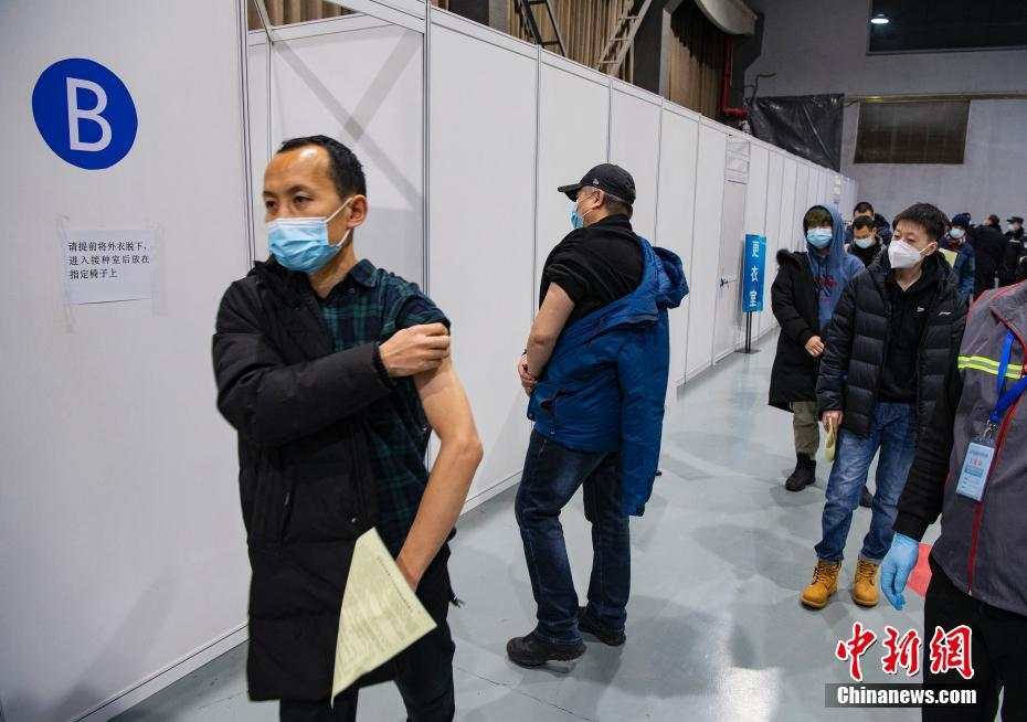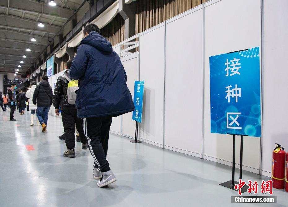 接种人员在设置于北京市朝阳区朝阳规划艺术馆的临时接种点进入新冠病毒灭活疫苗接种区。