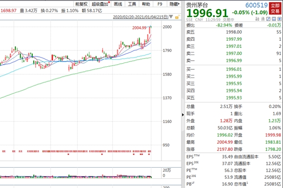 新年首日,市场延续着去年年末的强势走势,白酒股借势继续上攻。贵州茅台在白酒旺季开门红提振下,盘中突破2000元,再创新高,随后稍有回落。截至午间收盘,贵州茅台跌0.05%,报1996.91元。