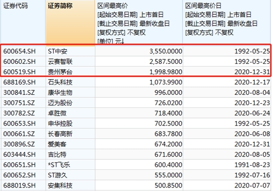 除了贵州茅台外,目前已经突破1000元大关的还有石头科技,康华生物今年上市后也一度逼近1000元大关,但目前股价已回落至500元左右。迈为股份、卓胜微、长春高新等多股则突破500元。