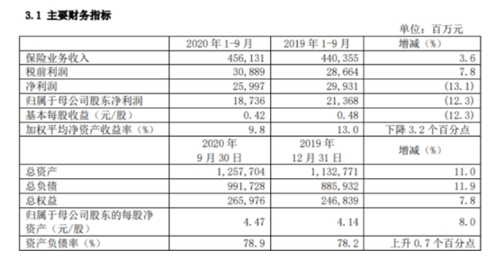 再看前三季度业绩。三季报数据显示,中国人保今年1-9月份业绩总体保持平稳,营业收入、扣非净利润保持增长,但净利润、净资产收益率出现下滑。