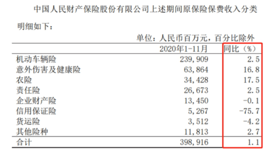 2020年面对疫情,中国人保的原保费收入仍保持了可贵则整体增长局面。披露信息显示,中国人保2020年1月1日至11月30日经由其子公司中国人民财产保险股份有限公司、中国人民人寿保险股份有限公司及中国人民健康保险股份有限公司所获得的原保险保费收入分别为人民币3989.16亿元、903.84亿元和306.23亿元,合计5199.23亿元。