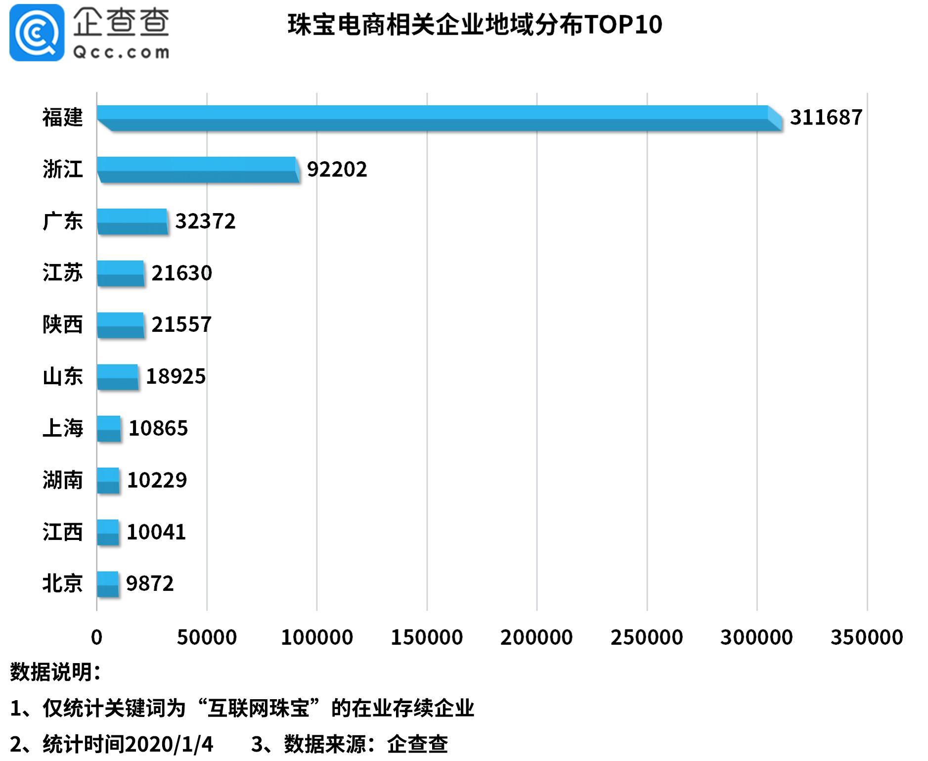 刚刚过去的2020年,直播带货、私域流量营销等在整个珠宝行业掀起了一股风潮,珠宝电商行业随之迎来大爆发。企查查数据显示,截至2021年初,全国范围内共有60万余家珠宝电商相关企业,福建省以31.2万家企业排名第一,独占全国总量的52%,浙江、广东分列二三名。近两年来,相关企业年注册量实现巨幅增长,2019年新注册企业9.1万家,同比增长225%,2020年新注册46万余家,同比增长402%。