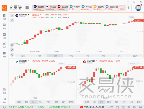 午后,创业板指午后继续走高,截至14:22,创业板指涨幅扩大至4%。南向资金净流入达110亿元。