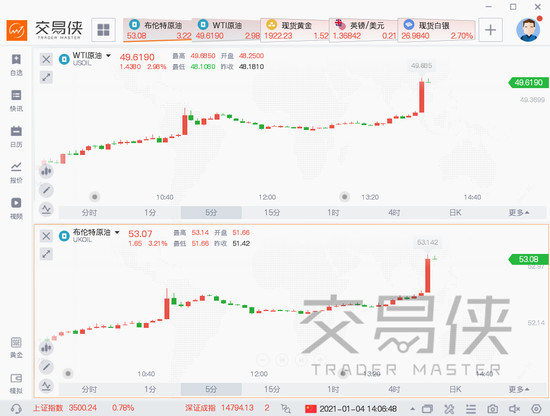 截至14:02,美、布两油继续拉升,涨幅扩大至超2%,分别报49.67美元/桶和53.07美元/桶。
