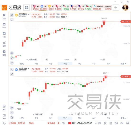 贵金属涨声一片,现货黄金升破1920美元/盎司,续刷11月9日以来高位。NYMEX铂金期货涨2.6%,站上1100美元/盎司。现货白银涨势不止,早盘已涨超3%,触及27.12美元/盎司。欧盘初,现货黄金上破1930美元/盎司,涨幅扩大至1.92%。COMEX期银涨超4%,现报27.47美元/盎司。