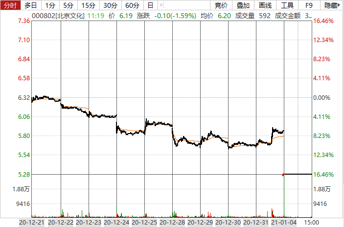 1月4日,北京文化开盘也是一字跌停,截至收盘,股价报5.28元,跌10.05%。