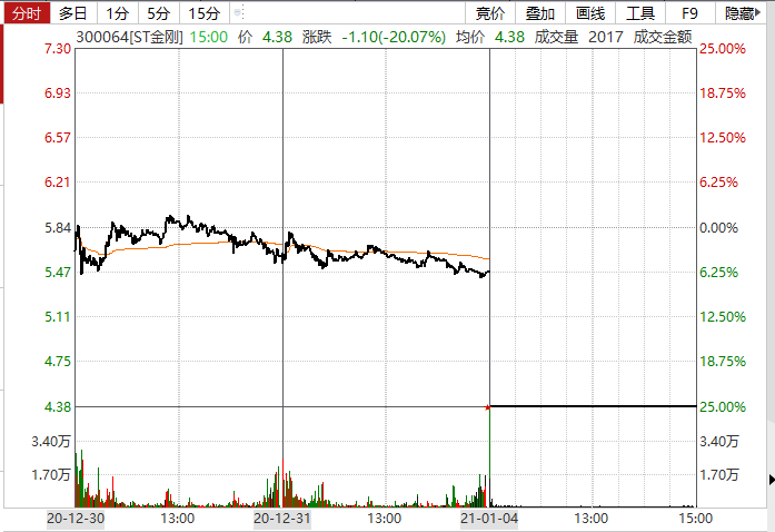 1月4日,ST金刚一字跌停,截至收盘,股价报4.38元,跌20.07%。