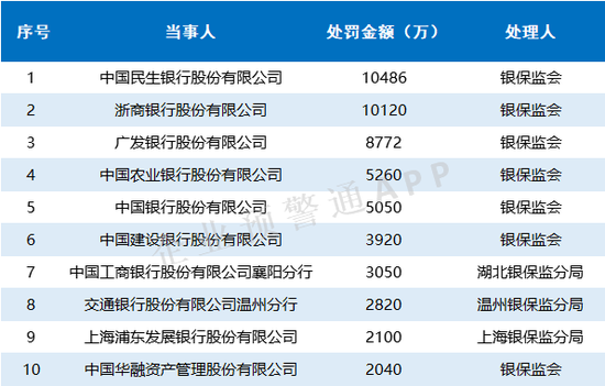 银保监系统雷厉风行,对违规行为作出严惩。全年最大罚单超1亿,由银保监会直接开出,处罚金额前十的机构包括9家银行与1家MAC。