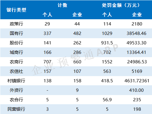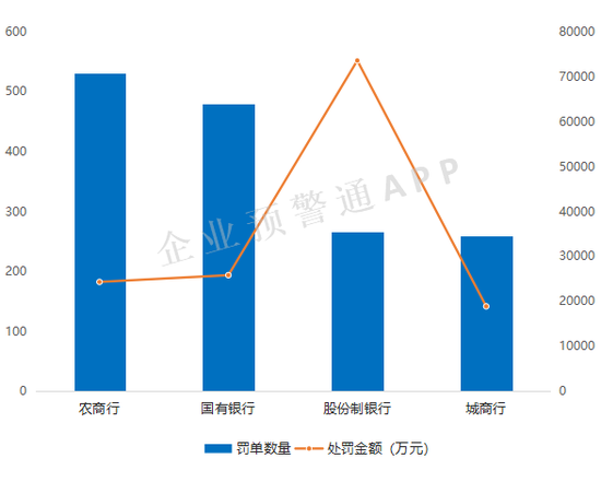 不同类型银行中,国有银行共收到罚单480张,罚没金额25829.79万元;股份制银行收到罚单共计266张,罚没金额73583.16万元;农商行收到罚单罚单530张,罚没金额24323.48万元;城商行收到罚单罚单259,罚没金额18893.30万元。(以下统计维度均已包括银行总行及各分支行)