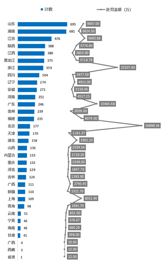 从地区角度看,收到的罚单数量排在前三的机构分别是:山东、湖南、江苏;处罚金额排在前三的则是:北京、浙江、广东。