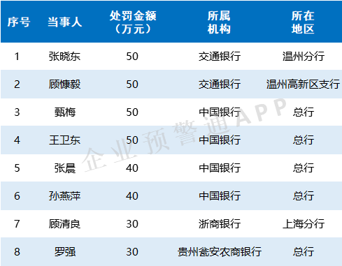 个人被罚金额的前六名只对应了两家国股行,其次被罚较高金额的个人来自农商行。