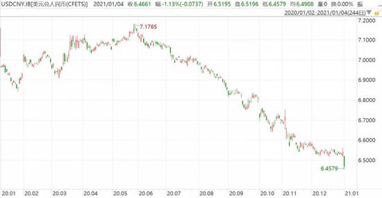 2021年1月4日,在岸人民币对美元汇率跳空高开200点,盘中接连收复6.50、6.49、6.48、6.47、6.46关口,最高涨至6.4579元,创下2018年6月20日以来新高,重返6.4时代。