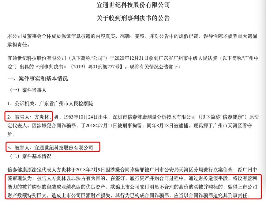 公告显示,公司为本案被害人,方炎林为本案被告人。倍泰健康原法定代表人方炎林于2018年7月9日因涉嫌合同诈骗罪被广州市公安局天河区分局进行立案侦查,经广州中院审理认为:被告人方炎林以非法占有为目的,在签订、履行资产并购合同过程中,通过财务造假手段,将没有盈利能力的被并购标的包装成业绩亮丽的优良资产,欺骗上市公司支付明显不合理的高价购买被并购标的,骗得上市公司财产数额特别巨大,造成上市公司巨额财产损失,其行为已构成合同诈骗罪,应当以合同诈骗罪追究其刑事责任。