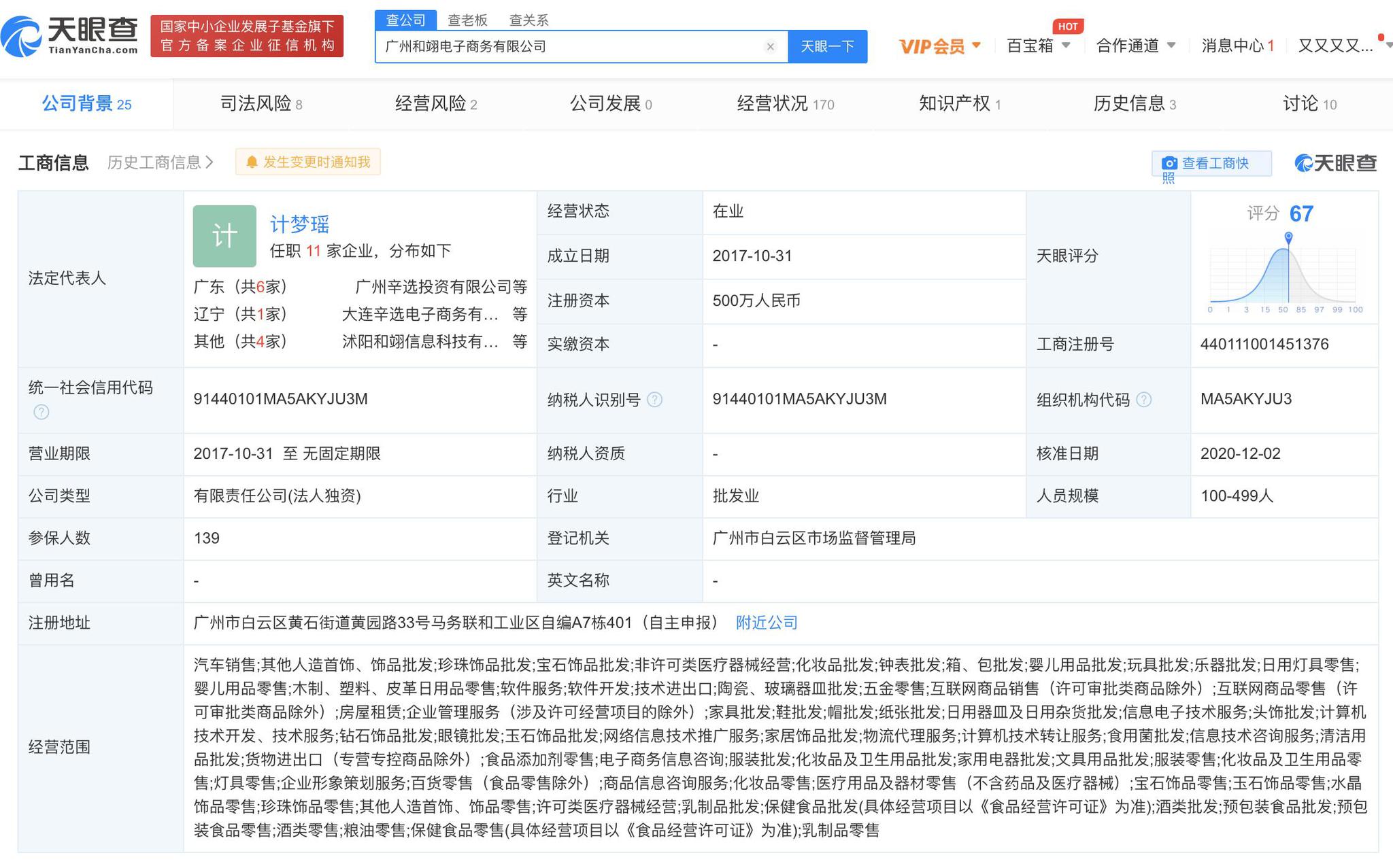 天眼查App显示,广州和翊电子商务有限公司成立于 2017年10月31日,法定代表人为计梦瑶,注册资本为500万人民币,经营范围包含汽车销售;其他人造首饰、饰品批发;珍珠饰品批发;宝石饰品批发;非许可类医疗器械经营等。
