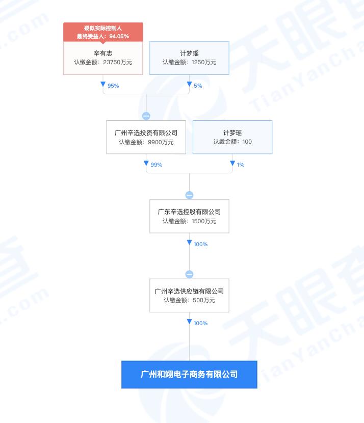 股权穿透图显示,该公司由广州辛选供应链有限公司全资持股,辛有志(辛巴)间接持股94.05%,为该公司疑似实际控制人。