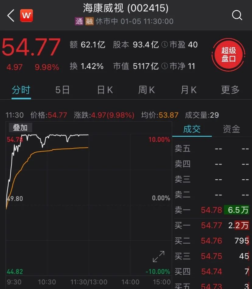 除了白酒股,海康威视今日表现也较为亮眼。海康威视小幅低开后迅速拉升,盘中多次触及涨停,总市值首次突破5000亿元。截至午间收盘,海康威视涨9.98%,报54.77元,最新总市值为5117亿元。中证君注意到, 1月4日,北向资金净卖出海康威视38.79亿元,净卖出额在当日北向资金净卖出十大个股中排首位。