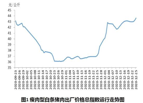 猪肉价格自11月底以来持续上涨。据农业农村部信息中心和山东卓创资讯股份有限公司联合监测,2020年12月21日-25日,16省瘦肉型白条猪肉出厂价格平均每公斤43.16元,环比小幅上涨0.5%,同比跌1.9%,较上周收窄0.6个百分点,已连续上涨7周,涨幅达17.6%。