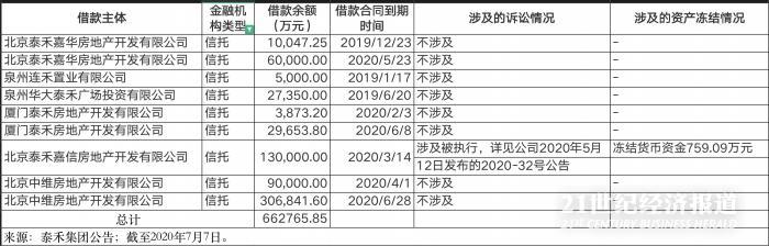 截至2020年7月7日,泰禾集团已到期未付的债务270.65亿元,除15亿元中期票据“17泰禾MTN001”和银行借款30.89亿元,其余均为非银行金融机构的融资逾期,其中信托借款余额约为66.28亿元。