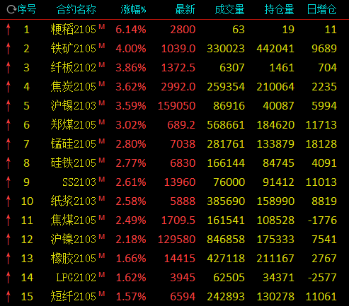 热点栏目1月5日,国内商品期货收盘多数上涨,黑色系卷土重来,铁矿石大涨4%,焦炭涨近4%,动力煤涨超3%,硅铁、锰硅涨近3%;有色走升,沪锡涨逾3%,不锈钢、沪镍涨逾2%;跌幅方面,苹果、低硫燃油跌近3%,燃油跌逾2%。
