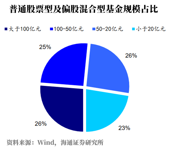 这次我们举例A股,海通研究所统计数据显示,截止2020年12月24日,普通股票型和偏股型公募基金共1614只,规模达到3.1万亿,其中规模超过100亿元的基金共有49只,规模总共8469亿元。从这个数据看,3%左右的基金数量,占据整体规模超过26%,头部现象确实明显。