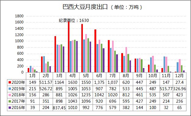 巴西政府周一发布2020年12月商品出口数据显示,2020年12月巴西大豆出口量仅为27.4万吨,创下2015年以来最低值,而去年同期出口量为326.96万吨。不过粗略估计,巴西大豆全年出口量为8906万吨,创下历史年度最高。
