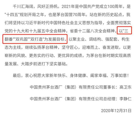 茅台集团在2021年新年贺词中也提出了“三翻番”,即产量、收入和利润翻番。对此,1月4日,国泰君安发布研报称,“十四五”期间预计茅台股份公司收入复合增速有望保持在12%-15%左右,同时在社会渠道与直销渠道协同发展的新营销体系下,未来预计将继续以结构升级、渠道优化释放发展动能,预计吨价有望保持良性增长趋势,利润增速将高于收入增长,增长确定性与稳定性持续凸显。