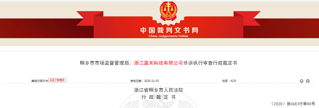 2020年12月10日,中国裁判文书网公示的一则行政裁定书显示,山东省邹平市市场监督管理局在查处被申请人浙江一哥网络科技有限公司等涉嫌传销一案时,为防止被申请人转移或者隐匿违法资金,于2020年10月28日向人民法院申请财产保全,请求对被申请人浙江一哥网络科技有限公司、浙江峰佳针织有限公司、浙江四季秀服饰有限公司、上海悦尘企业管理合伙企业(有限合伙)、王峰、何佳、李敏、任有法的银行存款421132000元予以冻结。