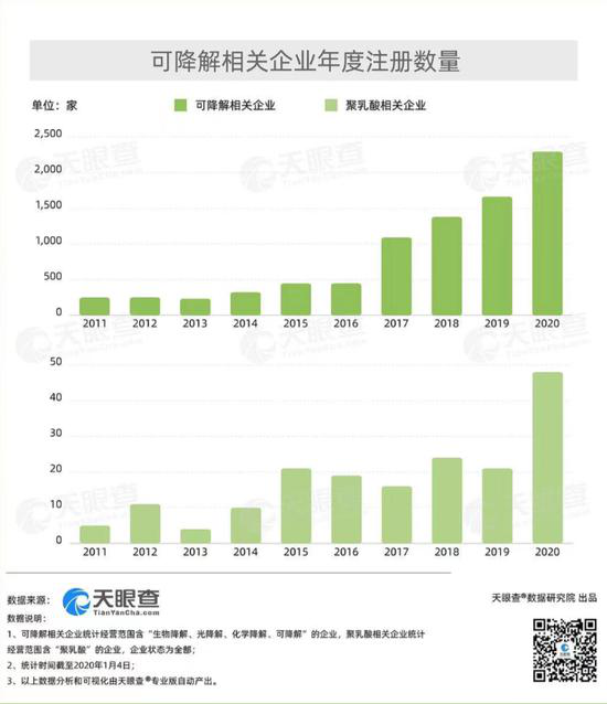 天眼查专业版数据显示,我国目前经营范围含“聚乳酸”,且状态为在业、存续、迁入、迁出的聚乳酸相关企业近200家。截至目前,以工商登记为准,我国2020年新增聚乳酸相关企业(全部企业状态)约48家,同比增长近129%。