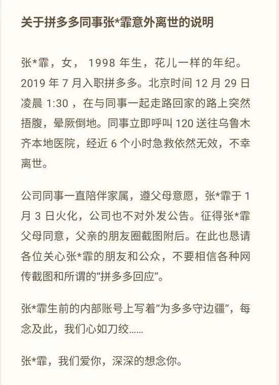 愤怒的网友们这才等到了一份“关于拼多多同事张*霏意外离世的说明”,只是说明一下而已。