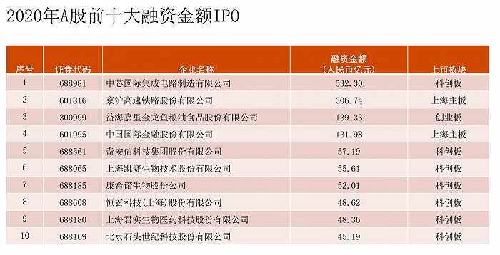 个股来看,2020年IPO前十大个股融资额累计达1417亿元,占全年IPO融资总额的30%,超过百亿募资额度的有4家公司,分别为中芯国际、京沪高铁、金龙鱼和中金公司。中芯国际以532亿元的融资额占据头名。IPO融资额前十大个股中科创板独占7家,科创板已成为最受欢迎的A股上市板块。
