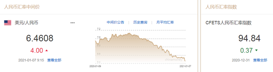 热点栏目1月7日,人民币中间价报6.4608,下调4点,上一交易日中间价报6.4604,在岸人民币上一交易日收报6.4615。