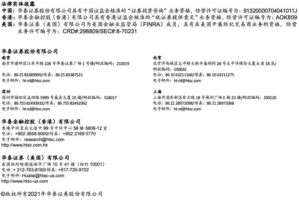 在任何情况下,本公众号中的信息或所表述的意见均不构成对客户私人投资建议。订阅人不应单独依靠本订阅号中的信息而取代自身独立的判断,应自主做出投资决策并自行承担投资风险。普通投资者若使用本资料,有可能会因缺乏解读服务而对内容产生理解上的歧义,进而造成投资损失。对依据或者使用本公众号内容所造成的一切后果,华泰证券及作者均不承担任何法律责任。