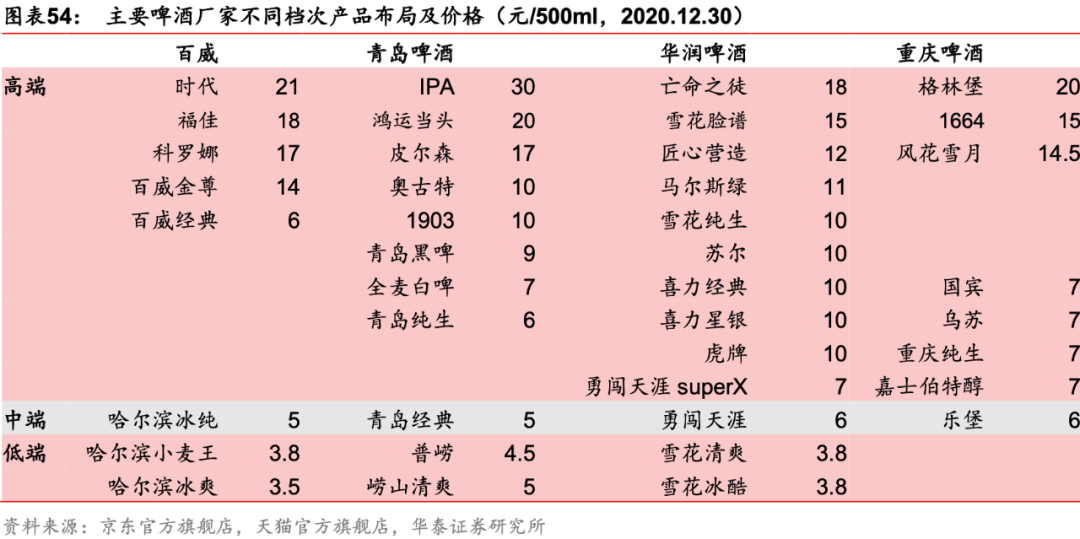 中低端白酒:中小企业或将加快出清,全国化品牌优势明显。我们认为,中低端白酒市场份额或将进一步萎缩,但整体仍然将是向具有品牌力的企业集中,今年疫情亦加快了中小企业特别是家庭作坊式企业的退出速度,中低端白酒此前无序化的竞争格局将有所改善,全国化品牌在挤压式竞争中产品、品牌以及渠道力优势明显,有望进一步抢占市场份额。