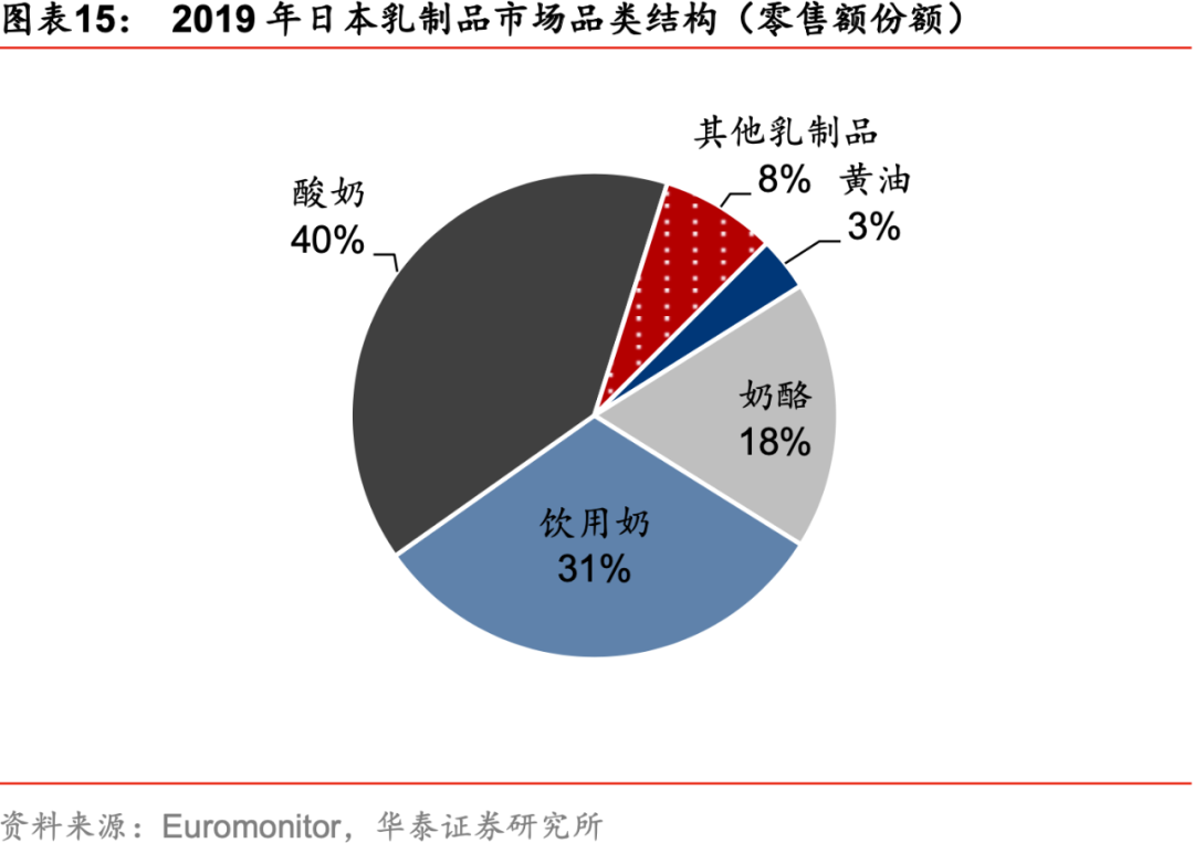对标日本市场:未来我国乳制品结构有望更加均衡。根据Euromonitor数据,我国乳制品(不含婴幼儿奶粉)品类结构相对集中,主要以饮用奶(62.1%)为主导;但日本市场品类分布更为均衡,酸奶(39.6%),饮用奶(31.3%)、奶酪(17.8%)品类均占据重要市场。我国消费者的饮食习惯与口味偏好与日本较为相似,因此我们认为后续我国乳制品市场的消费结构有望向日本倾斜,未来我国乳制品的消费结构有望更加均衡,酸奶、奶酪等其他品类收入贡献或继续提升。