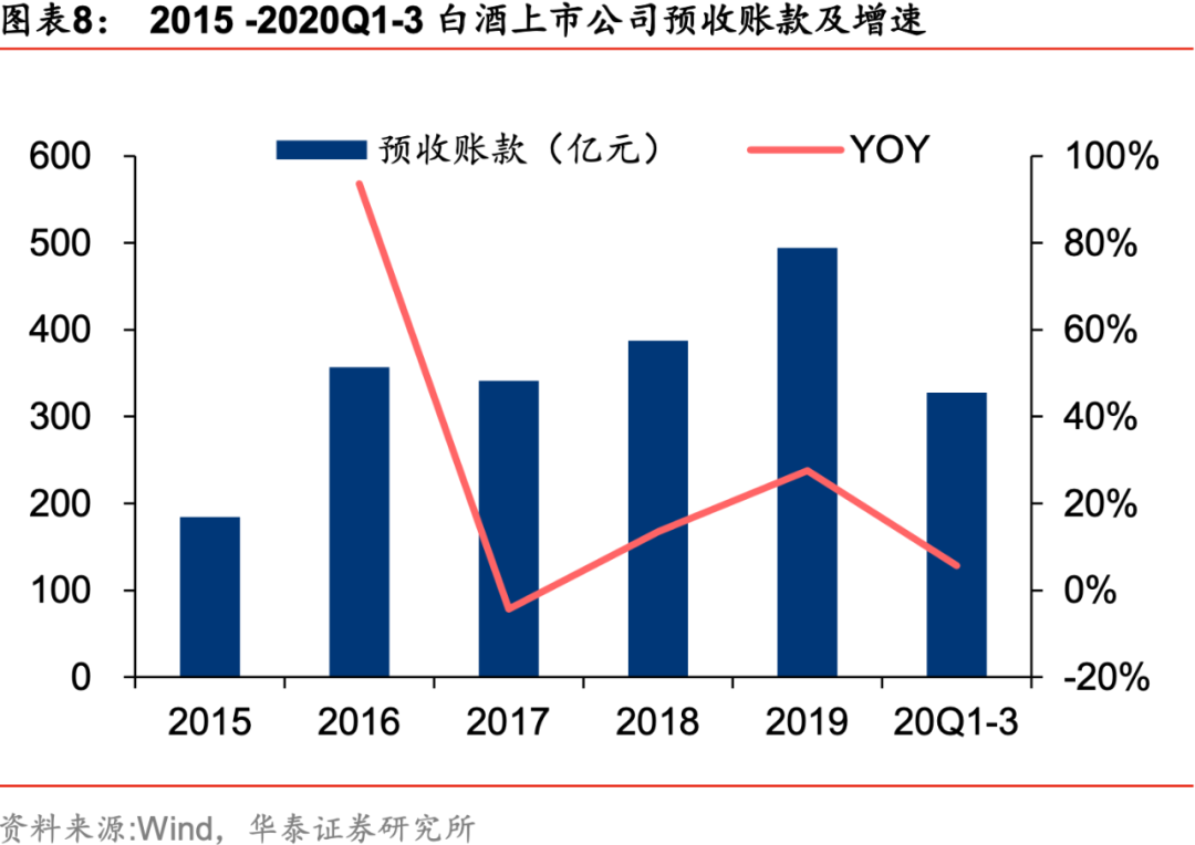 从预收款维度,20Q3末预收款(合同负债)环比转增,经销商打款意愿恢复,为未来收入增长奠定信心。2020Q3末白酒行业预收账款为327.6亿元,较2019年末下降33.7%,系20年春节提前,春节打款集中在19年末使得基数较大所致;预收款环比20Q2末增长11.1%,由于Q2期间大部分厂家为减轻经销商资金压力放缓打款节奏,Q3下游动销恢复,打款恢复。总体来看,大部分白酒企业20Q3预收账款环比20Q2末均有所回升。