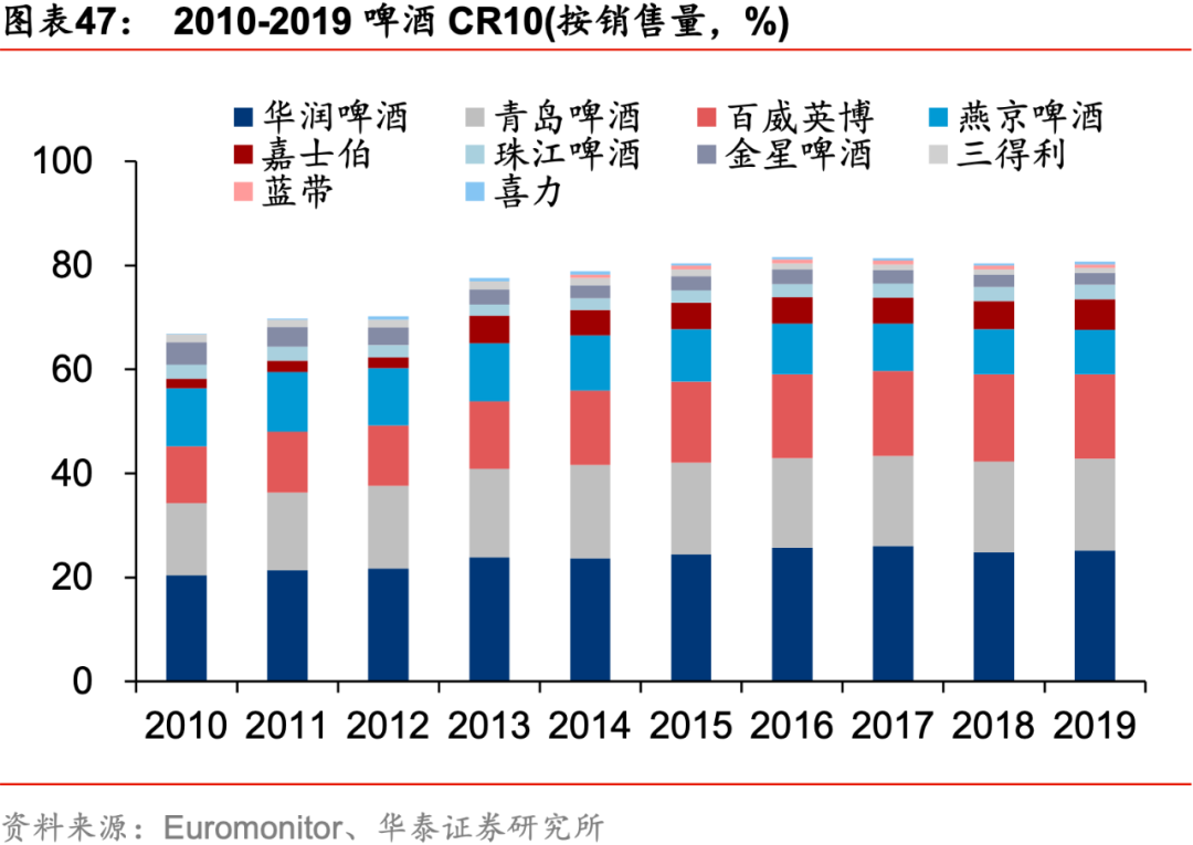 整合并购潮后头部格局基本稳定,短期疫情助推集中度提升。在行业扩产期,小企业由于环保、税收、成本弱势等因素退出行业或被龙头归并,目前头部企业通过收购基本完成产能及市场布局,寡头垄断格局形成,华润/青岛/百威稳居行业前三,19年市占率分别为25.2%/17.6% /16.3%,较2010年分别提升4.8/3.8/5.3pct,13年以来CR10基本稳定在80%,行业格局基本稳定;从区域市场看,龙头跑马圈地已近尾声,局部均衡基本形成。头部企业在全国跑马圈地,搭建起各自的优势市场,华润啤酒(辽/川/贵/皖/苏)、青岛啤酒(鲁/沪/琼/冀/晋/陕)、燕京啤酒(京/桂)及百威、嘉士伯立足优势市场,发挥产能、品牌、渠道等独有优势,主导区域啤酒消费,黑/吉/内/青等虽无绝对龙头,但亦形成双寡头或三寡头格局,局部基本实现均衡。新冠疫情下中小企业生产恢复较慢,啤酒龙头产能布局全国且渠道较为完善,疫情期间韧性凸显,收入及利润表现均优于行业整体,预计市场份额将继续扩大,行业竞争进一步内化为龙头间的较量。