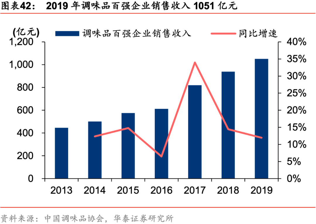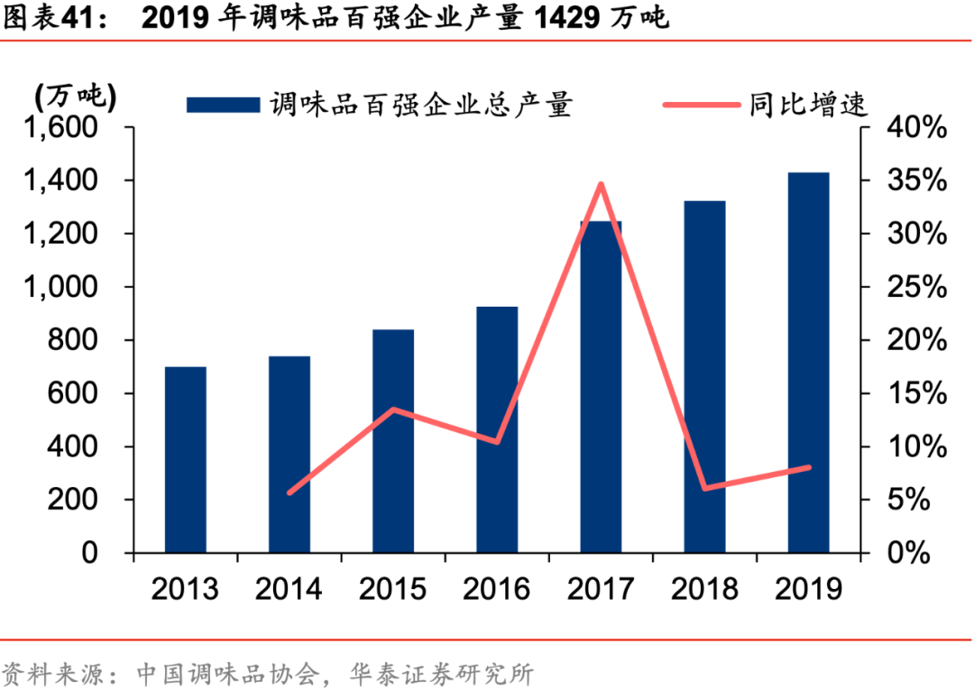 调味品偏刚需属性,进入量价齐升阶段。根据中国调味品协会的统计数据,2019年调味品百强企业的总产量达到1428.9万吨,同比增长8.1%;百强企业销售收入达到1051.1亿元,同比增长12.0%;销售收入增长高于产品产量增长,量价齐升,说明调味品产业进入高质量增长新阶段。2019年国内百强调味品企业的收入在整个调味品发酵制品制造行业收入占比仅为29.2%,调味品行业的集中度仍然处于相对较低的状态。我们预计龙头市占率将稳步提升,主要由于其长期积累的品牌价值、深度覆盖全国的渠道以及规模优势和管理效率带来的费用控制优势。