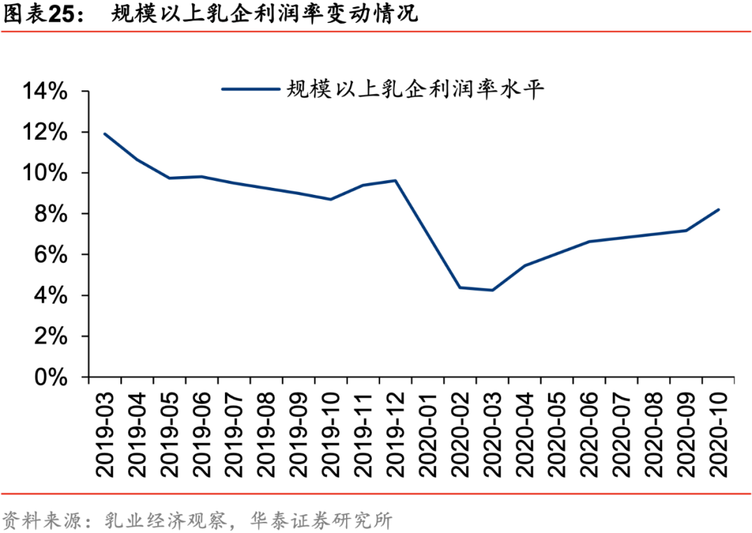 2)常温奶高端化发展趋势确定,满足人们健康需求。伴随着超高温灭菌工艺的不断进步,高端常温奶也能保留大量优质乳蛋白、原生钙等营养成分,充分满足消费者对于健康的需求。乳制品迈入消费升级品质时代,常温高端化仍将引领行业发展,产品结构优化有望带动提价增利。